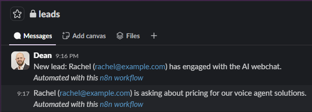 Alerts the relevant channel with automated Slack messages any time a lead shares their name and email, plus any time they show possible buying intent.