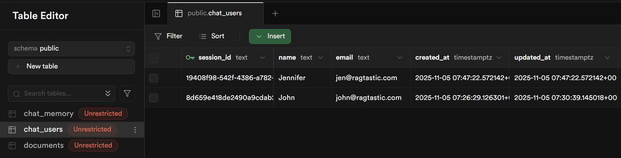 chat_users (session_id, name, email), documents (vector store), chat_memory (conversation history)