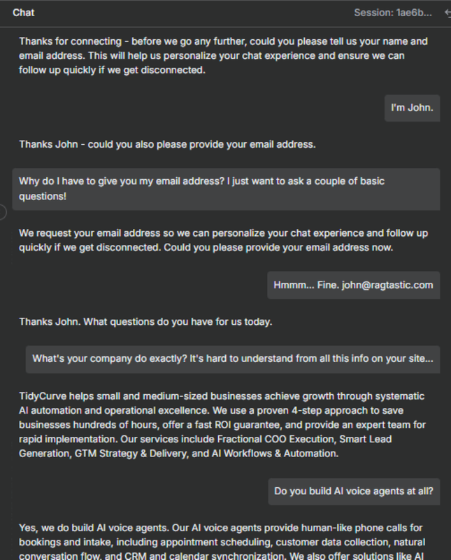 - Gates conversations behind identity capture (requires name + email before answering questions)