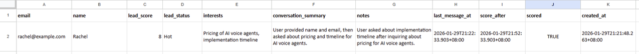 - A Google Sheet with columns: email, name, lead_score, lead_status, interests, conversation_summary, notes, last_message_at, score_after, scored, created_at