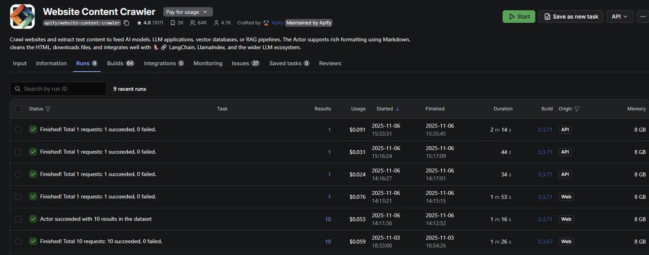 Tip: Start with page limits to test content quality before full-site scraping. Review chunks in Supabase and adjust Apify filters if needed for better vector embeddings.