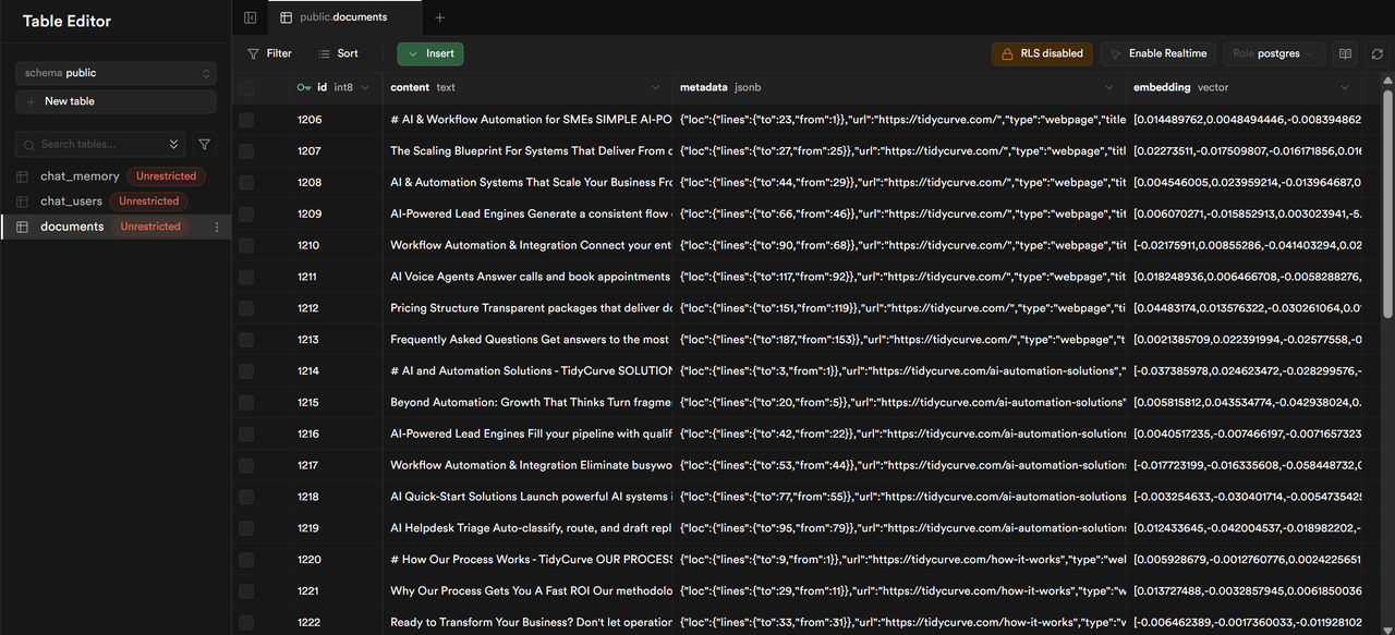 Supabase docuemnts table with scraped website content ingested in chunks with vector embeddings