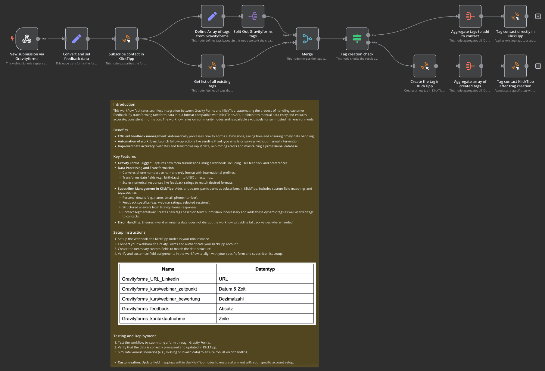 Gravity Forms Customer Feedback Form Integration: This workflow streamlines the process of handling customer feedback submitted via Gravity Forms. It ensures the data is correctly formatted and seamlessly integrates with KlickTipp.