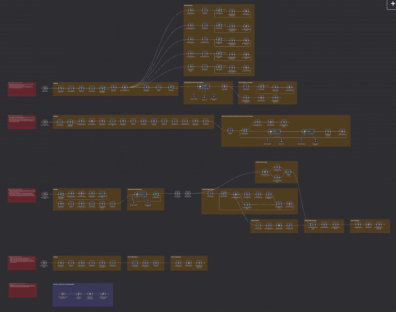 This template automates significant portions of the WordPress content creation process, utilizing Airtable as the central hub for management and user interaction, while leveraging AI for research and copywriting. The system is composed of four interconnected n8n flows, each handling a distinct stage of the content lifecycle. In addition, there is a sub-workflow dedicated to the research tool (Perplexity).