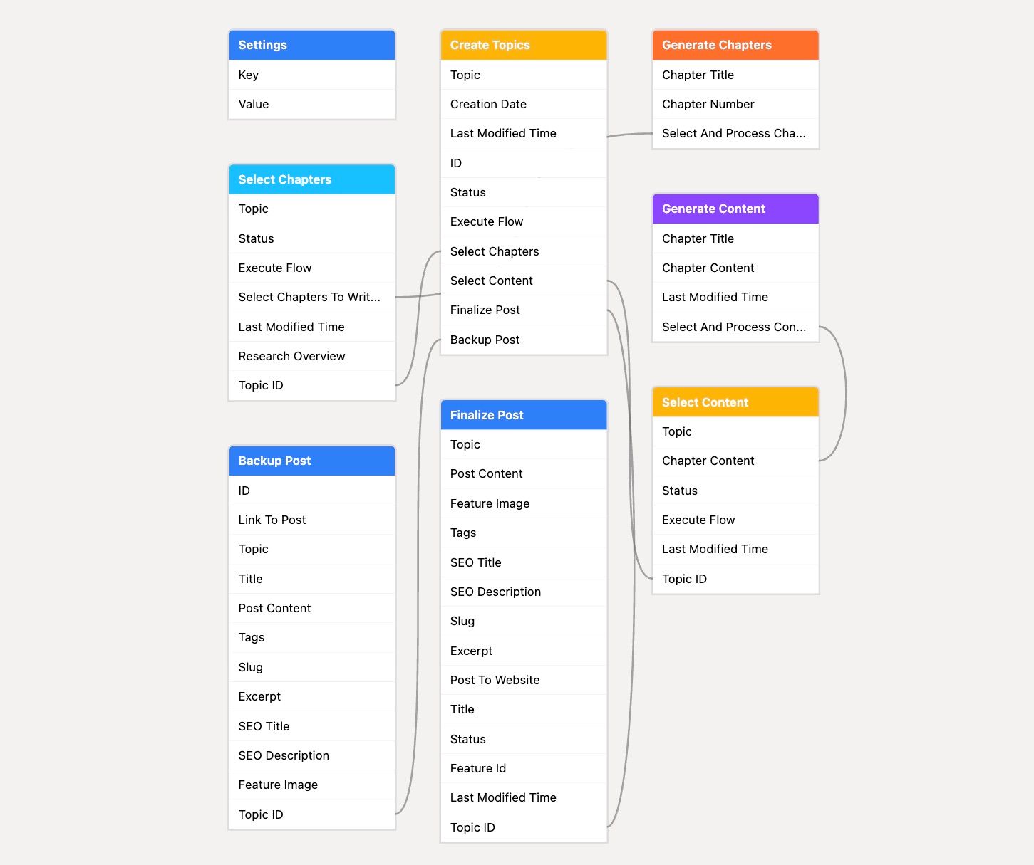 - Finalize Post (“Finalize Post“ Table): The third flow aggregates the approved content, generates the title, SEO metadata, tags, chapter images and featured image, placing all compiled information in the “Finalize Post” table for your final review. When the final article is ready to be published on your website, mark the status as "To Do" and check the "Ready to Publish" box to activate the fourth and final flow.