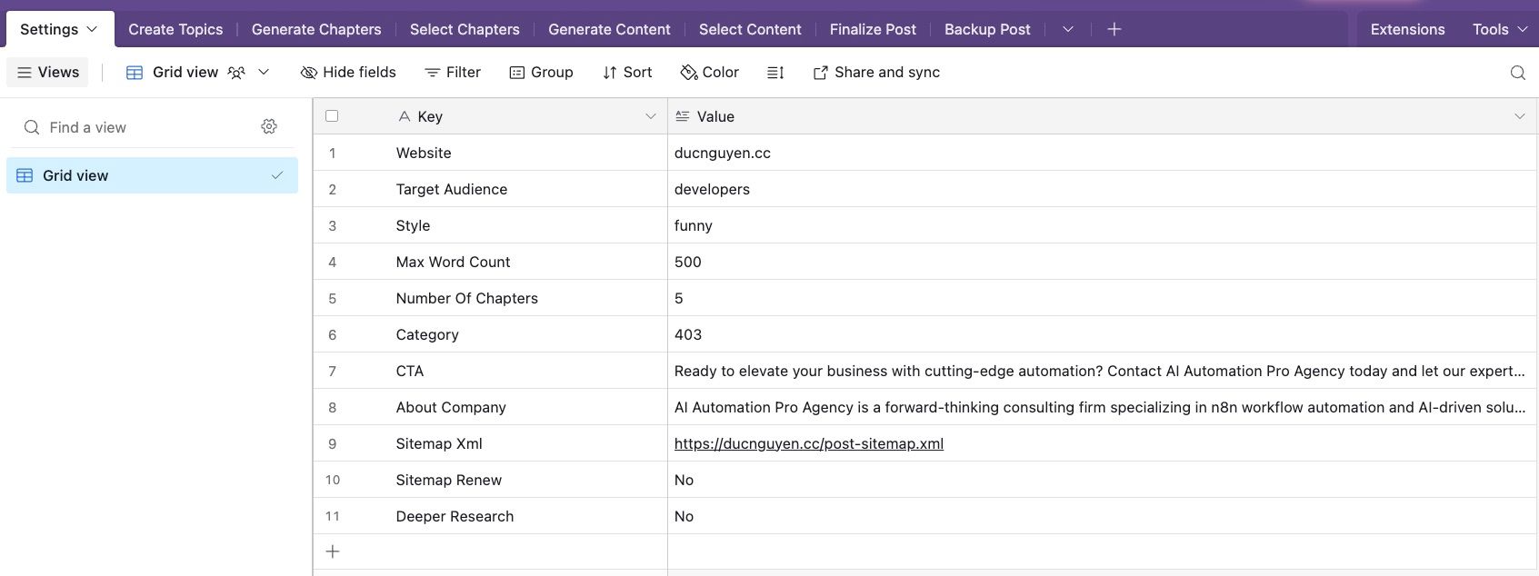 - Configure Settings (“Settings” Table): Define global parameters (website details, target audience, writing style, category IDs, about us, CTA etc.) in the “Settings” table. These serve as default inputs for the AI.