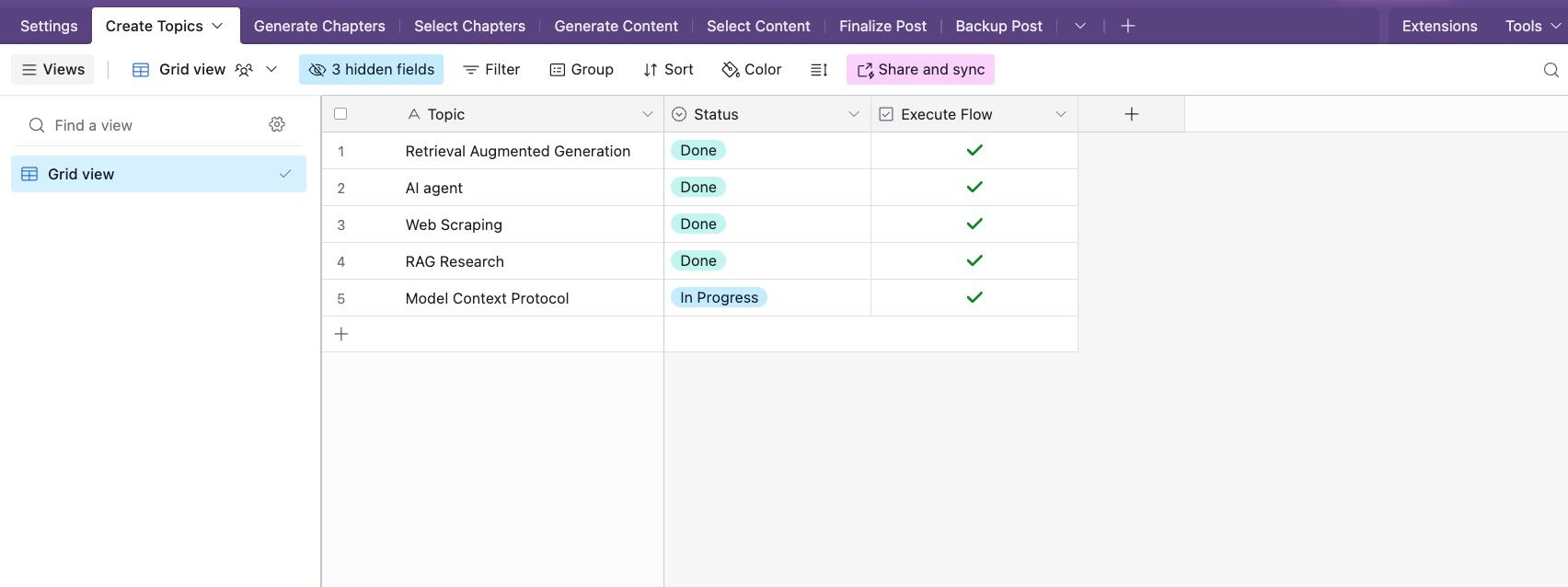 - Start Creating: Go to the Create Topics table in Airtable, add a new topic, go through the process and get amazed by AI magic!
