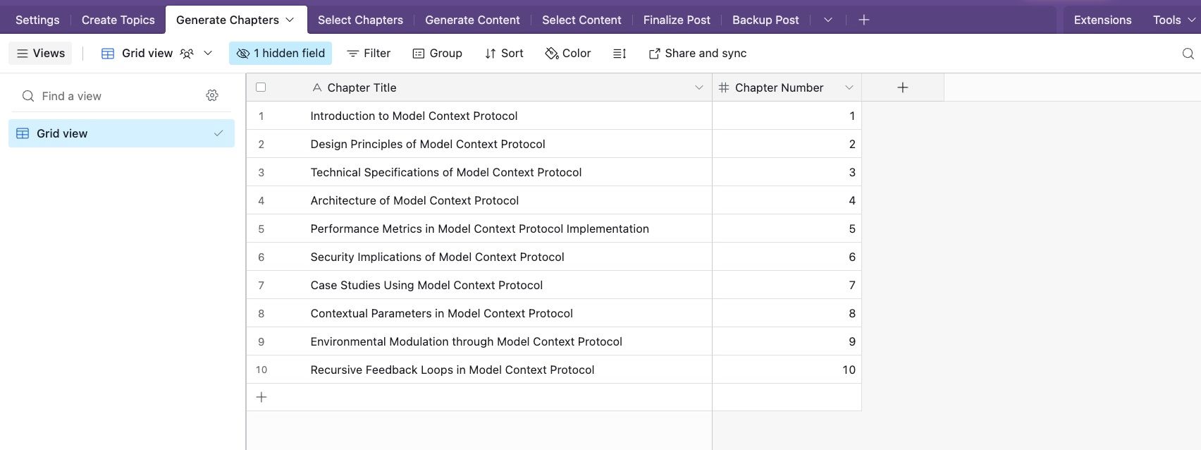 - Action: Fetches settings from Settings. Performs initial research (e.g., via Perplexity). Uses AI to generate chapter outlines. Saves suggestions as new records in the “Generate Chapters” table.