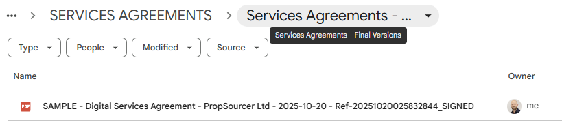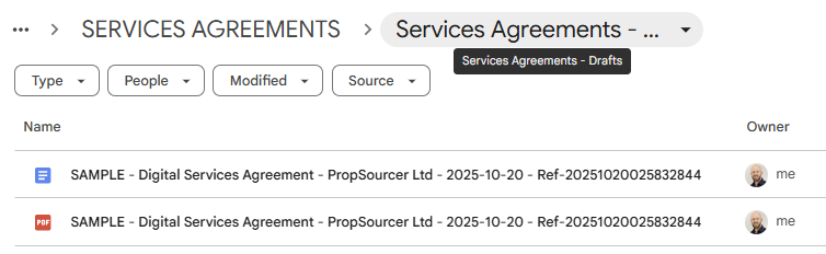 - Google Drive folders: "Services Agreements - Drafts" and "Services Agreements - Final Versions"
